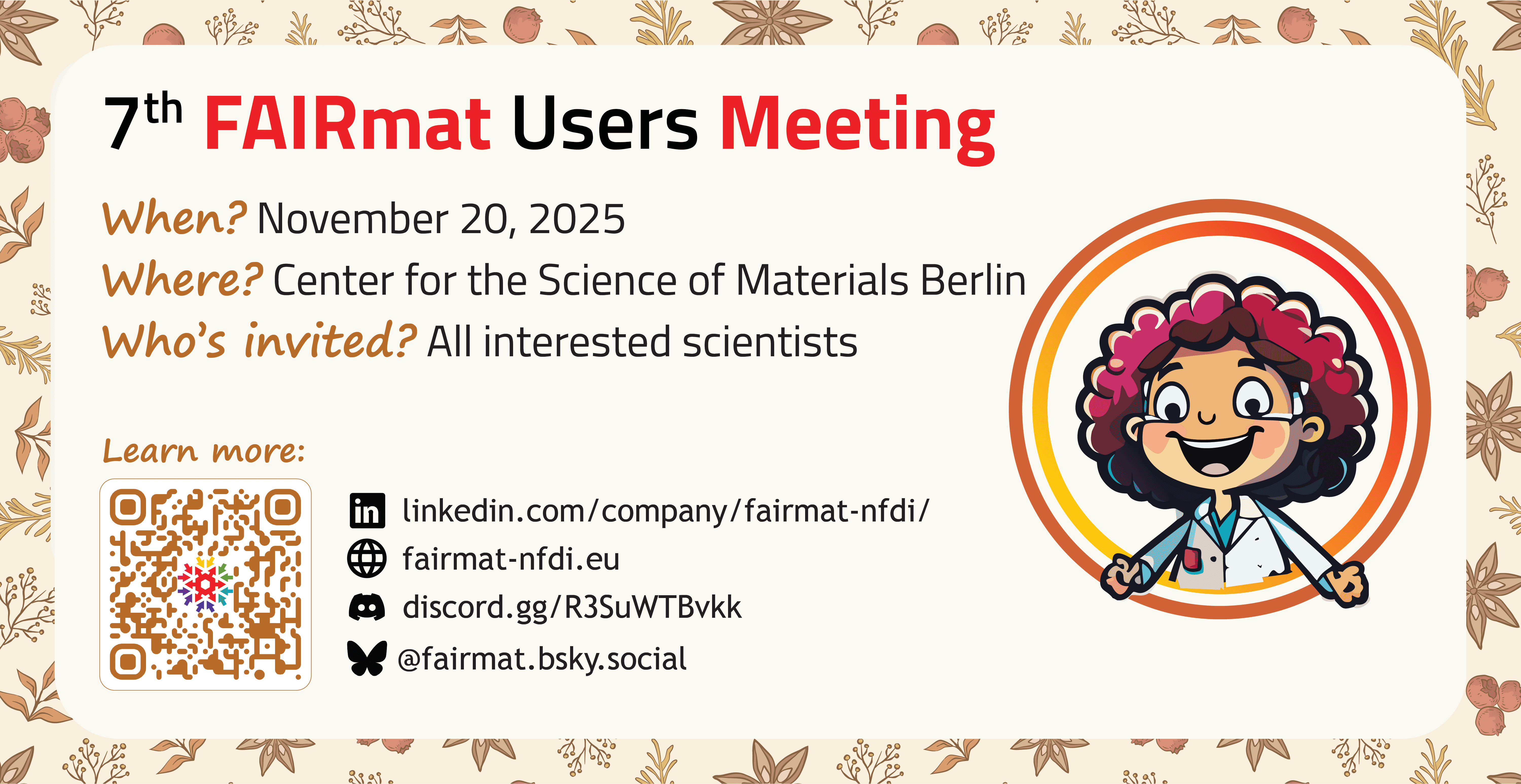 We are pleased to announce the seventh FAIRmat Users Meeting, which will take place in Berlin on November 20, 2025.