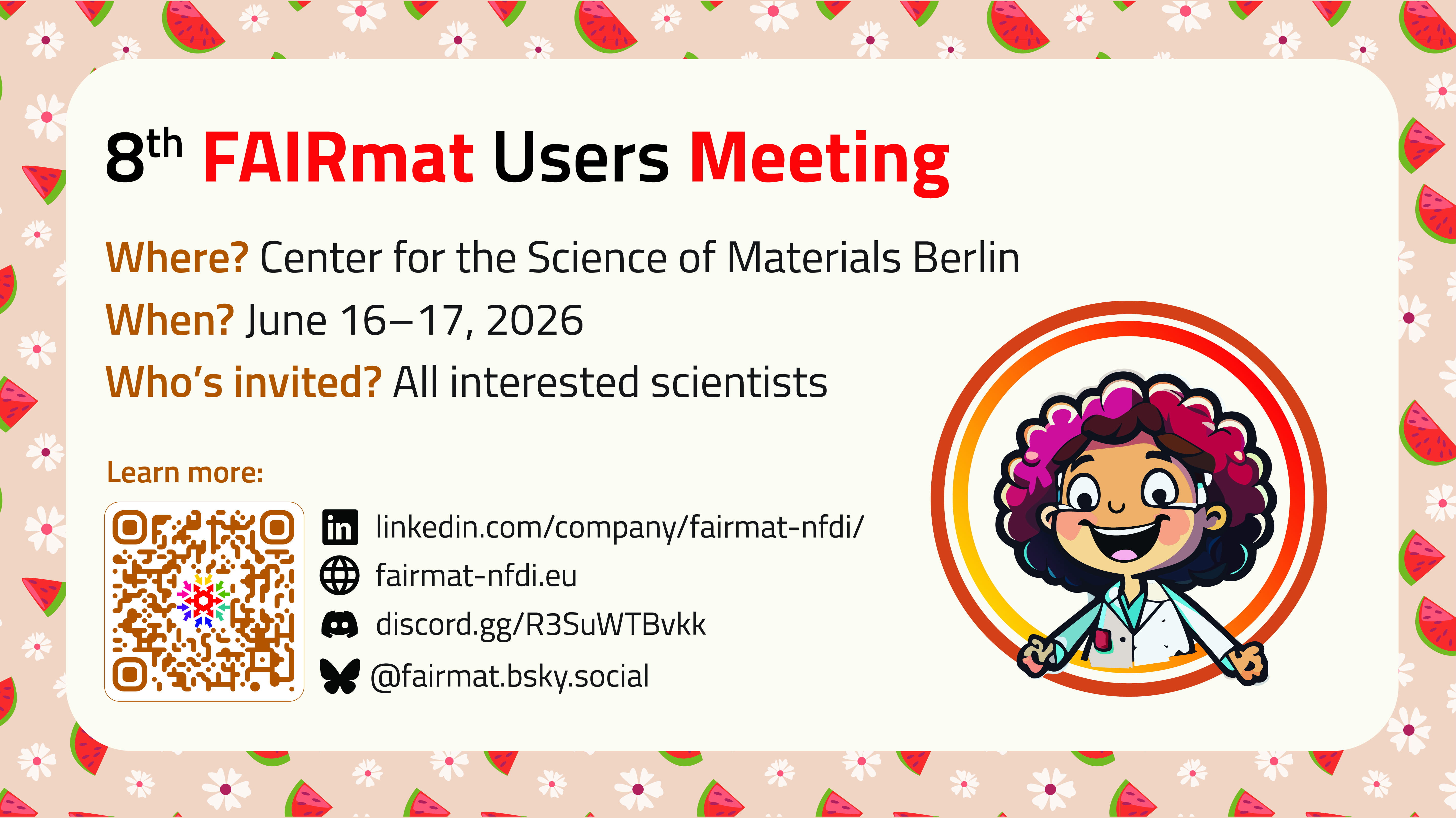 We are pleased to announce the eighth FAIRmat Users Meeting, which will take place in Berlin from June 16 to 17, 2026.
